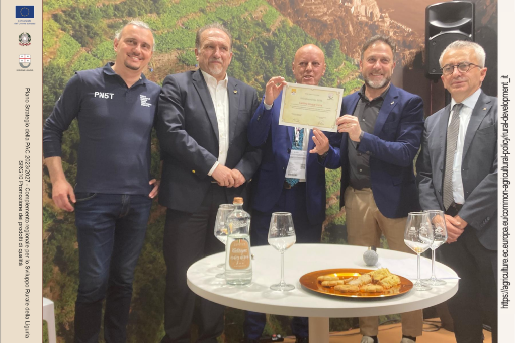 Il Vicepresidente e Assessore all’Agricoltura di Regione Liguria Alessandro Piana e Marco Rezzano, Presidente di Enoteca Regionale della Liguria, congiuntamente hanno firmato e consegnato il premio a Luciano De Batté, narratore delle Cinque Terre, che lo ha ritirato per conto della cantina sociale.